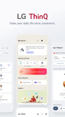 Fuatilia matumizi yako ya nishati kwa urahisi na ufanisi. Kazi ya 'Ufuatiliaji wa Nishati' inakuwezesha kulinganisha matumizi yako ya umeme na majirani zako, kukuwezesha kuweka malengo ya kuokoa nishati na kupokea arifa za hali ya matumizi. Pata huduma kamili za utunzaji wa bidhaa zako zote katika sehemu moja. Kutoka kwenye programu, unaweza kushughulikia kila kitu kuanzia utatuzi wa matatizo hadi maombi ya huduma. Tumia kazi ya 'Smart Diagnosis' kuangalia hali ya bidhaa yako, au panga ziara ya fundi mtaalamu kwa uchunguzi na ukaguzi sahihi. Kwa maswali kuhusu vifaa vya nyumbani vya LG ThinQ, 'Piga Gumzo na LG' inatoa majibu yanayolingana na hali na utendaji wa bidhaa yako, ikitumia akili bandia kukupa usaidizi wa haraka na sahihi.